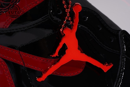 The Air Jordan 1 High Bred Patent features black and red patent leather upper with signature weaved Nike Air tongue labels. From there, a classic Wings logo on the collar and a white with red Air sole complete the retro design.